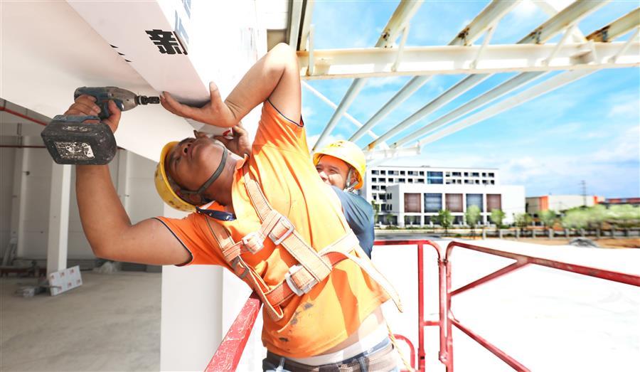 该项目负责人莫剑生介绍,仓储配一体库主要建设6栋库房,目前项目主体基本建成,正紧张有序收尾。为了加快项目进度,项目部在做好防暑降温、安全施工等保障措施的同时,采取多班组、多工种在不同的库房交叉作业,目前工地上有七八个班组在施工,施工内容包括外立面、挡雨棚、通风管、地面硬化施工等。