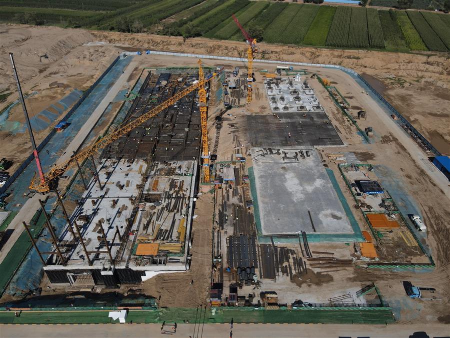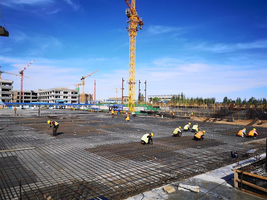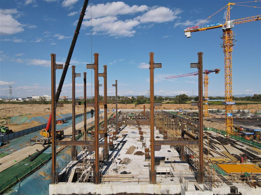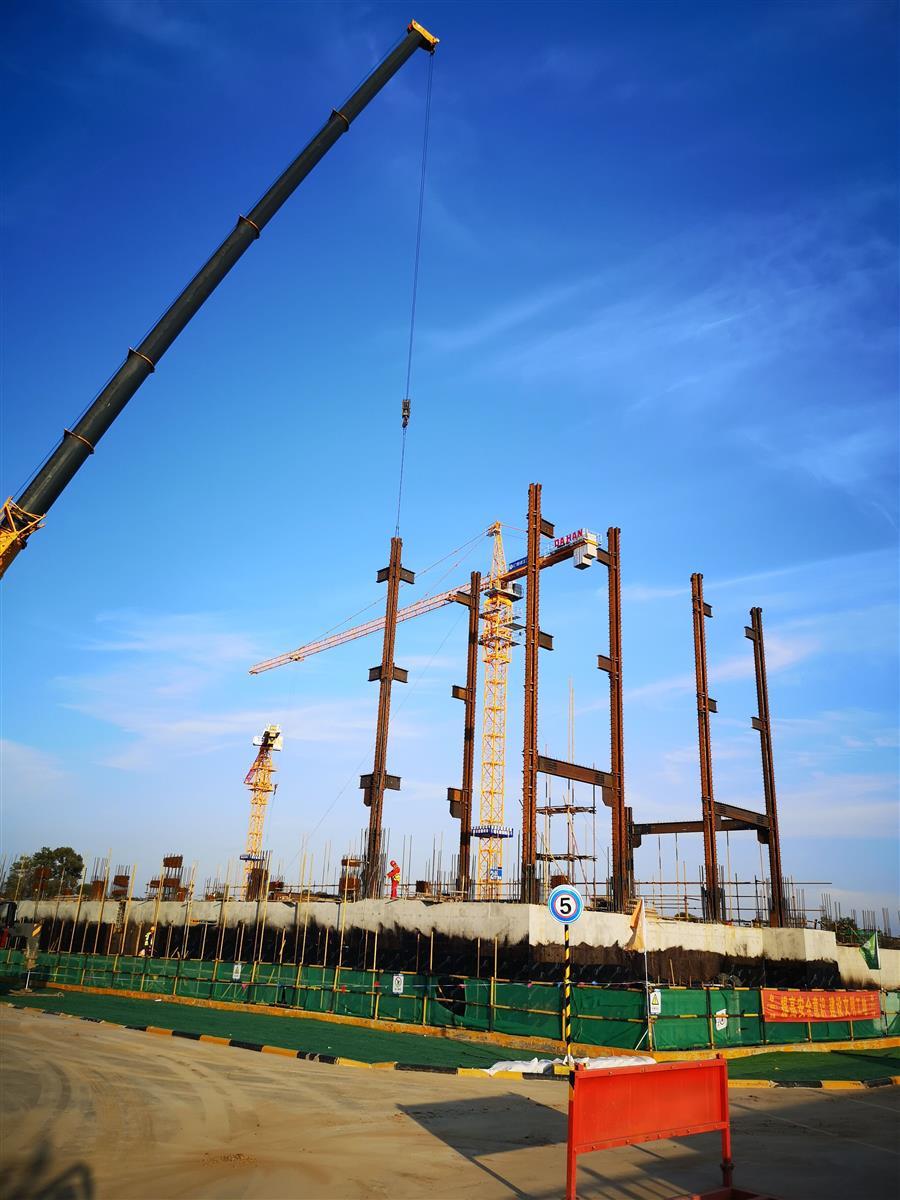 目前,项目正在进行主体施工,施工现场正紧张有序地进行着模板安装、钢筋绑扎、水电管线预埋、钢结构吊装等工作。