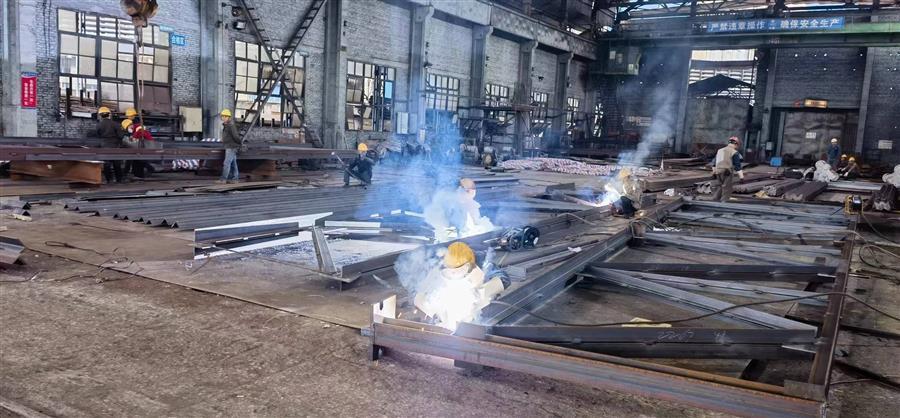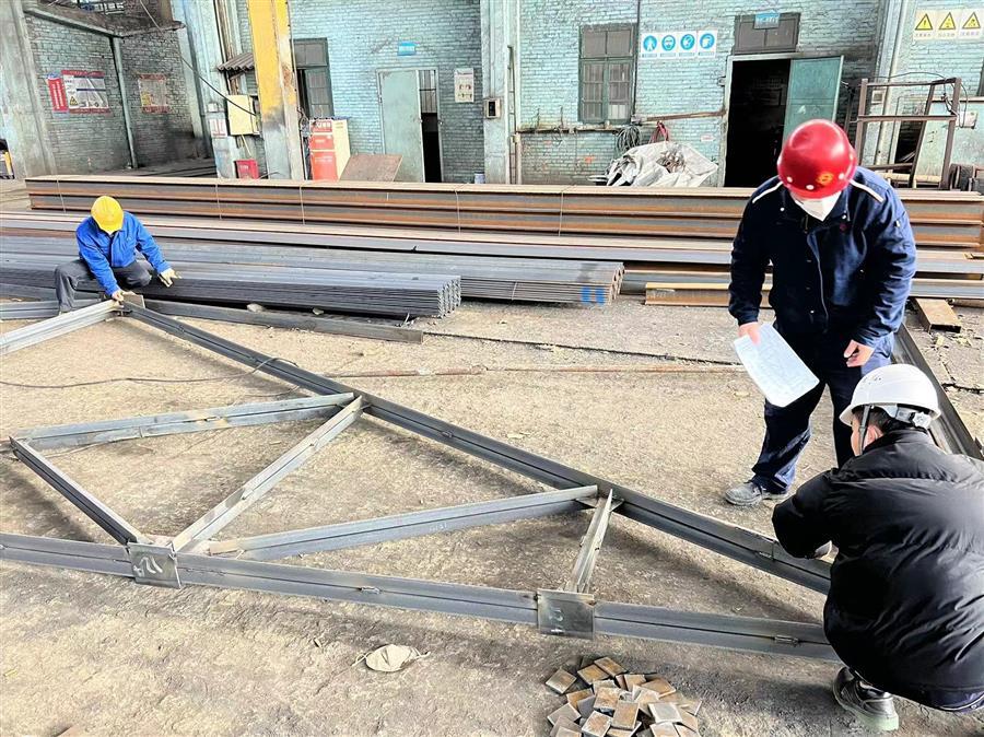 广西柳钢环保公司钢渣厂1#厂房气窗及3-11#柱屋面钢结构与彩瓦更换工程钢结构预制加工现场,焊接“火花”不断,工人作业有序。据了解该项目属于检修项目,工期紧,需提前加工预制完后,才能拆除现场旧屋架,现场生产环境高温腐蚀严重,为了确保项目施工安全,施工班组每天进场前都要进行安全交底。当前,该项目完成5片屋架组队,2跨天窗主体钢框架,所有构件制作完成,整体已完成年前计划进度约85%,加工过程中甲方随机抽检均合格。