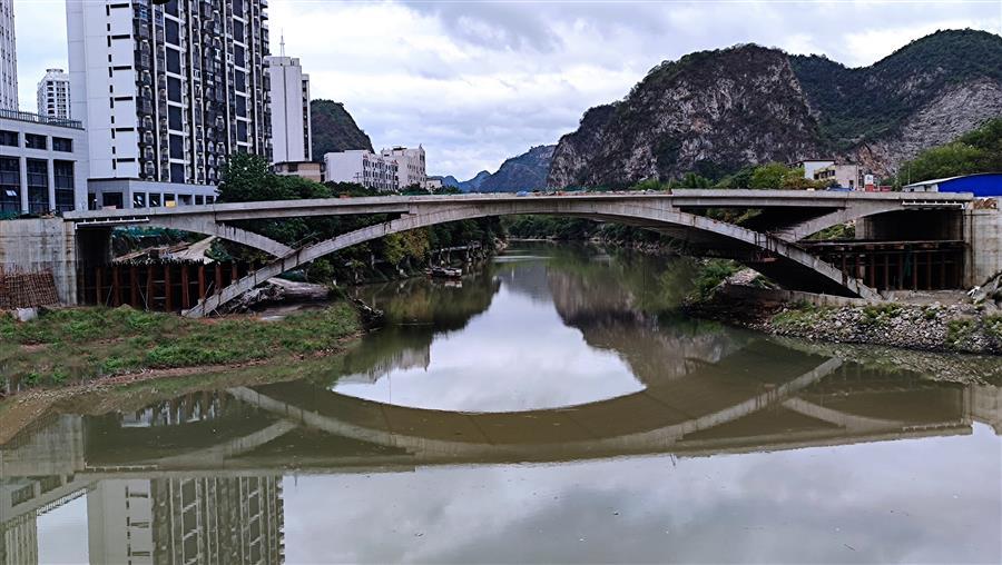 河池市龙江六桥(辉乐桥),全长211.19米,其中主桥长128.10米,净跨径90米、净矢高13.50米、桥总宽26.5米。