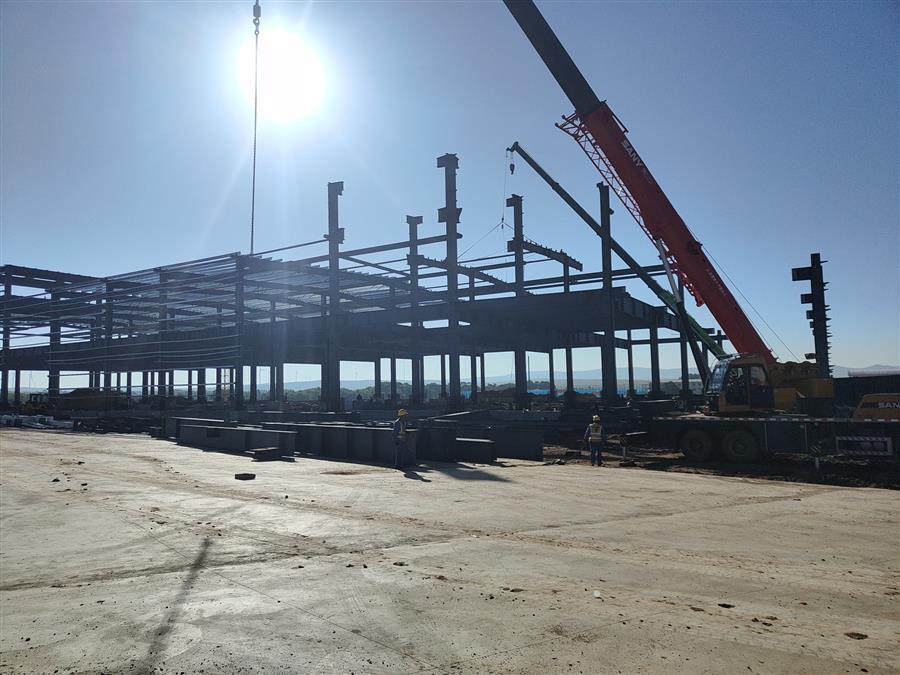 目前,该项目2#配送中心5-12轴钢结构完成100%,正在进行1-4轴二层钢柱牛腿焊接、6.65米钢梁安装及二层钢柱安装。2#冷库4-12轴交E交J轴防水板混凝土浇筑完成,正在加固13-18轴地下室顶板模板,绑扎4-12轴交A交E轴防水板钢筋。