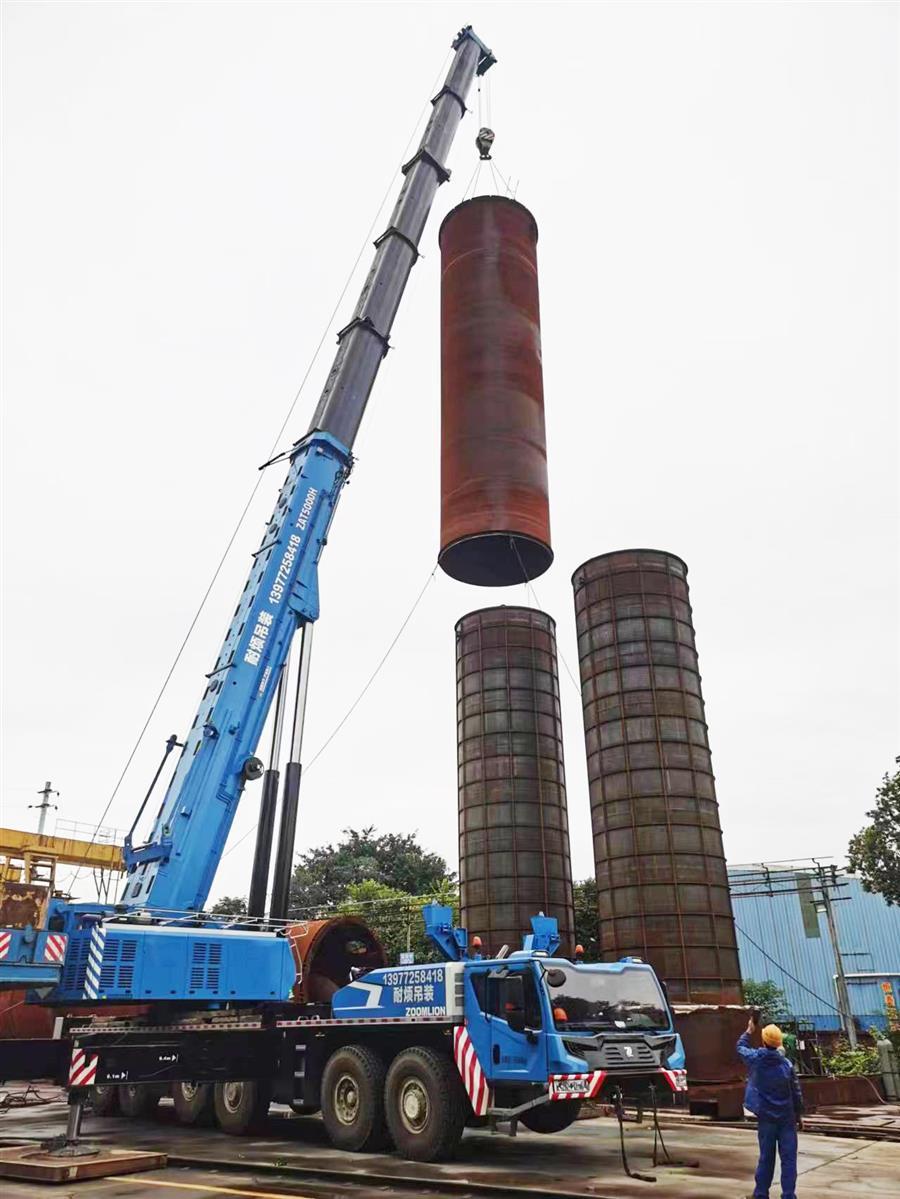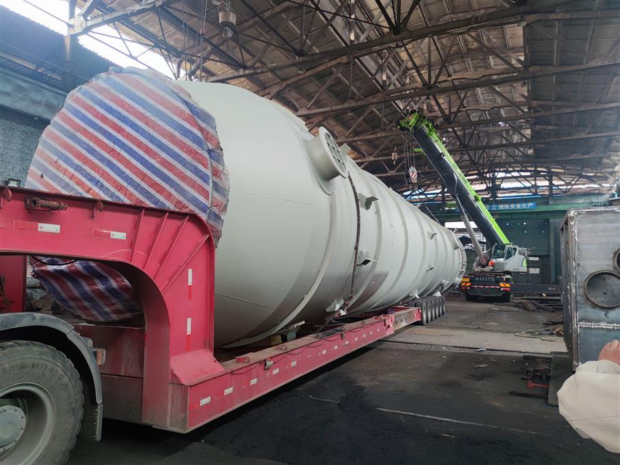 该工程共制作压力容器设备4台,其中空气预冷系统空冷塔1台,塔身直径4.236米,塔高28.450米,塔重约71吨;水冷塔1台,塔身直径3.824米,塔高22.1米,塔重约38吨;分子筛吸附器2台,塔身直径4.236米,塔高18.120米,塔重约63吨。