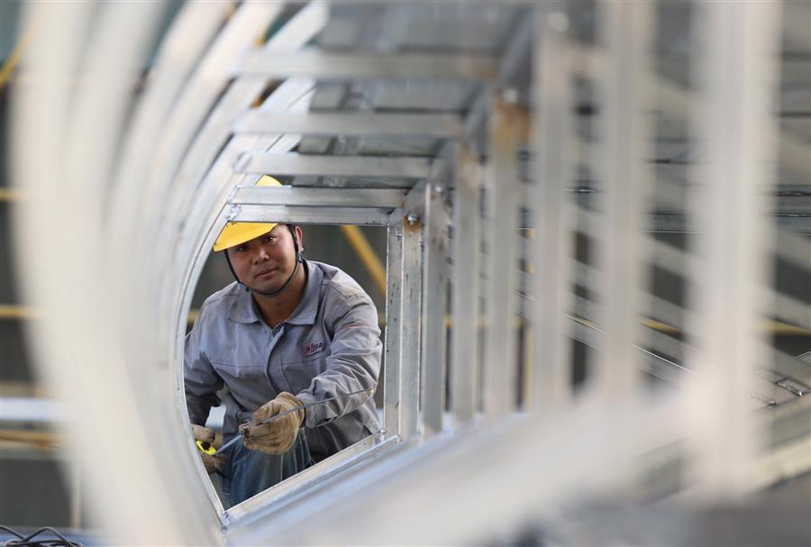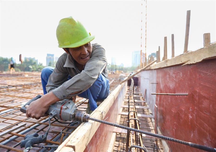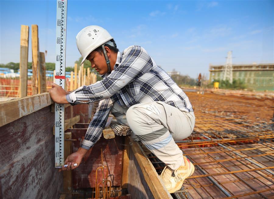 11月5日,工作人员在检查已扎好的钢筋网情况。