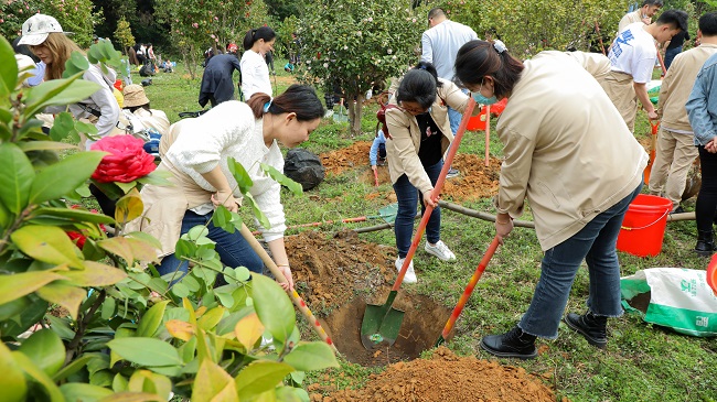 扶正树苗、填土夯苗、踩实泥土、提桶浇水......植树现场一片忙碌的景象。在专业技术人员红马甲的指导下,大家分工明确,配合默契,栽下一棵棵寄寓相思的红豆树苗。植树活动结束后,青年志愿者还进行了园林清扫活动。